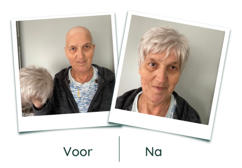 “Mijn mama verblijft in een woonzorgcentrum en de verzorgenden zetten bij mijn mama haar pruik elke dag mooi op. Ze komt ook weer meer buiten nu met een pruik, en we halen haar ook weleens op voor een uitstapje wat heel leuk is.